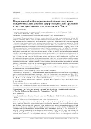 В настоящее время известно много численных методов, но, к сожалению, методу граничных элементов (МГЭ) и его модификациям уделяется незаслуженно мало внимания, хотя он, как метод конечных элементов и метод конечных разностей, также является одним из наиболее успешных современных численных методов с высокой точностью полученных результатов. В этой связи представляется актуальным дальнейшее развитие МГЭ для решения задач, основанных на применении предварительно вычисленных точных фундаментальных решений. В данной статье (часть III), являющейся логическим продолжением ранее опубликованных статей (части I и II), с помощью операционного (метод комплексного интегрального преобразования Фурье) и безоперационного (метод функционального анализа) методов удалось решить задачу по поиску фундаментального решения линейного дифференциального уравнения в частных производных с постоянными коэффициентами на примере задачи изгиба тонкой однородной изотропной нанопластины, дифференциальное уравнение для которой получено в рамках нелокальной теории микроструктурной деформации. Показано, что метод функционального анализа позволил существенно упростить методику вычисления фундаментальных решений без необходимости предварительного глубокого изучения математической теории обобщенных функций и без привлечения аппарата операционного исчисления. Отмеченная теория и аппарат, к сожалению, до сих пор часто воспринимаются исследователями как трудные для понимания, что порой ограничивает область применения МГЭ.